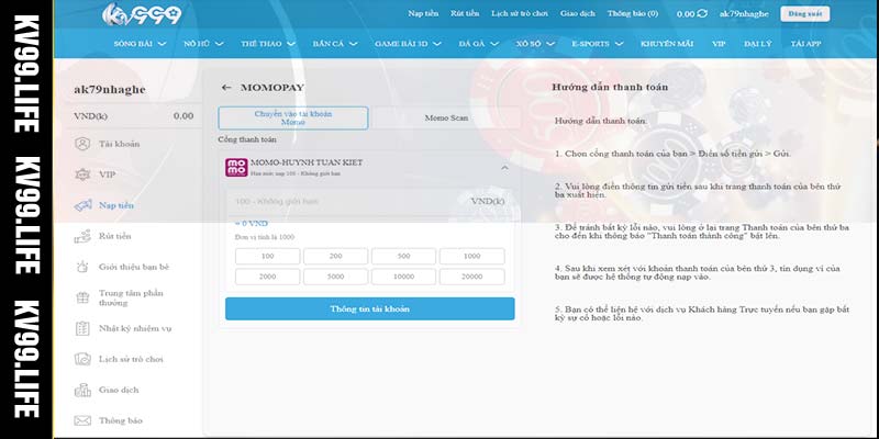 Hướng dẫn nạp tiền KV99 bằng ví điện tử Momo