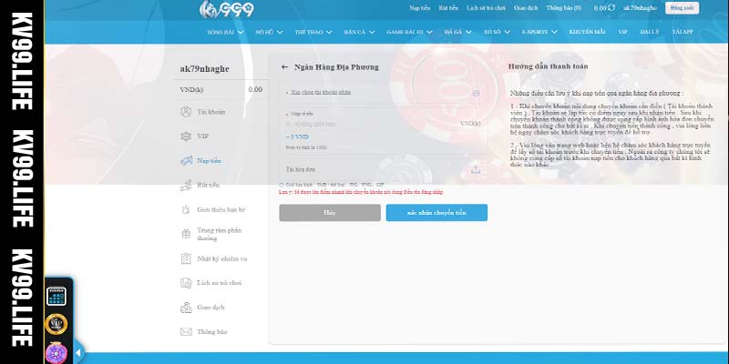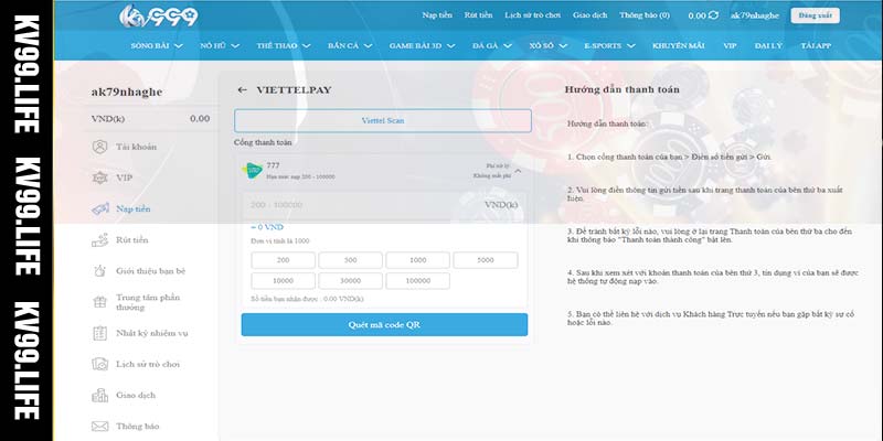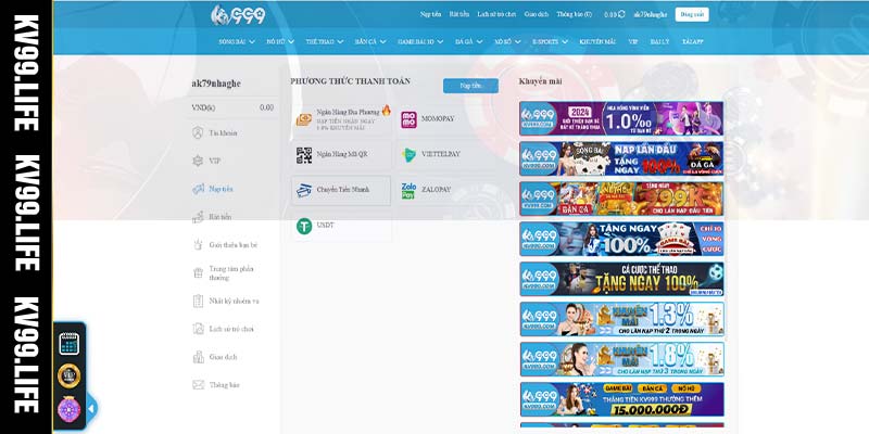Hướng dẫn nạp tiền KV99 qua thanh toán online
